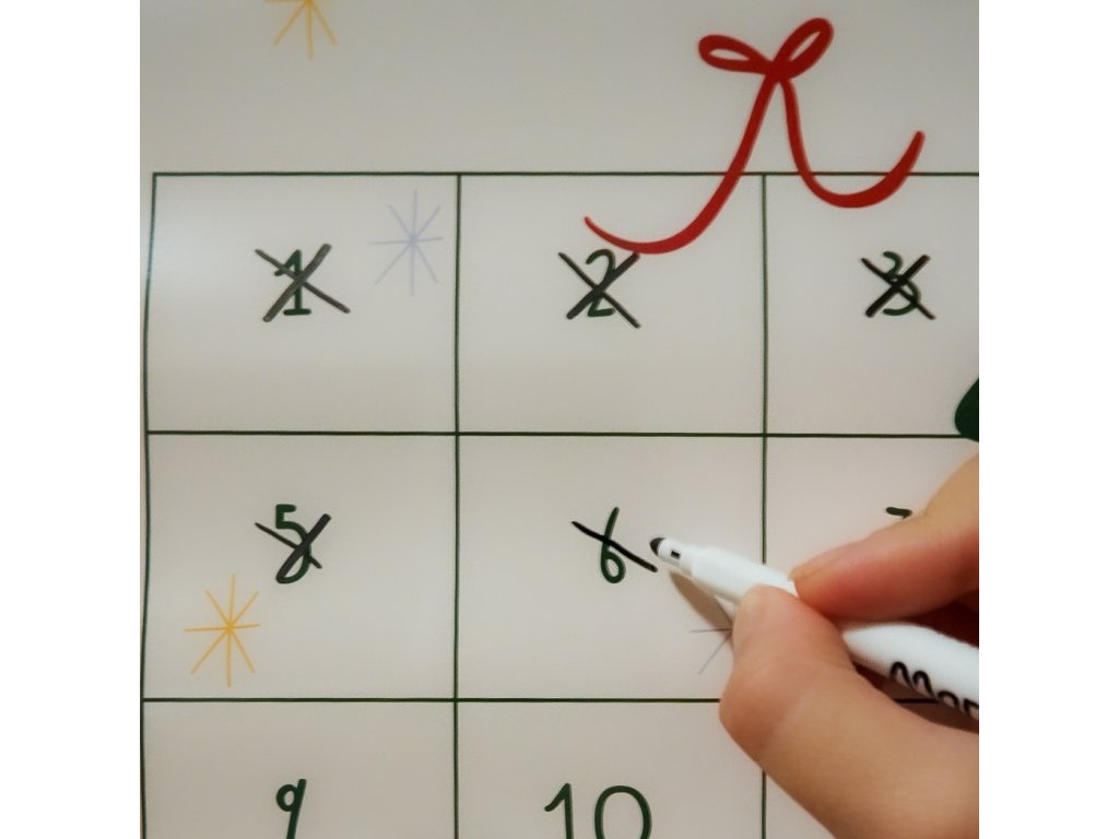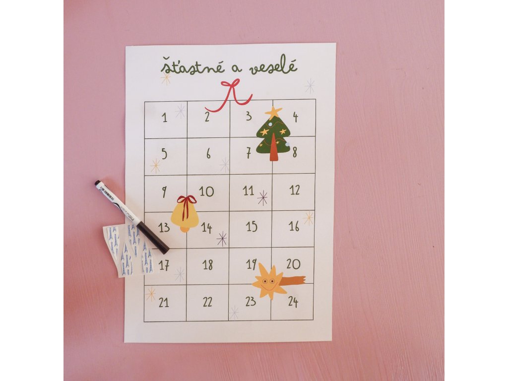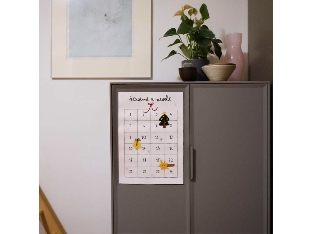 Plakát snadno připevníte kamkoliv pomocí 4 oboustranných lepicích proužků, které jsou součástí balení – lze je opakovaně použít a neničí podklad. Součástí balení je také mazací fix, díky kterému jednoduše přeškrtnete políčko v daný den. Fix lze snadno smazat, takže plakát využijete i další rok.