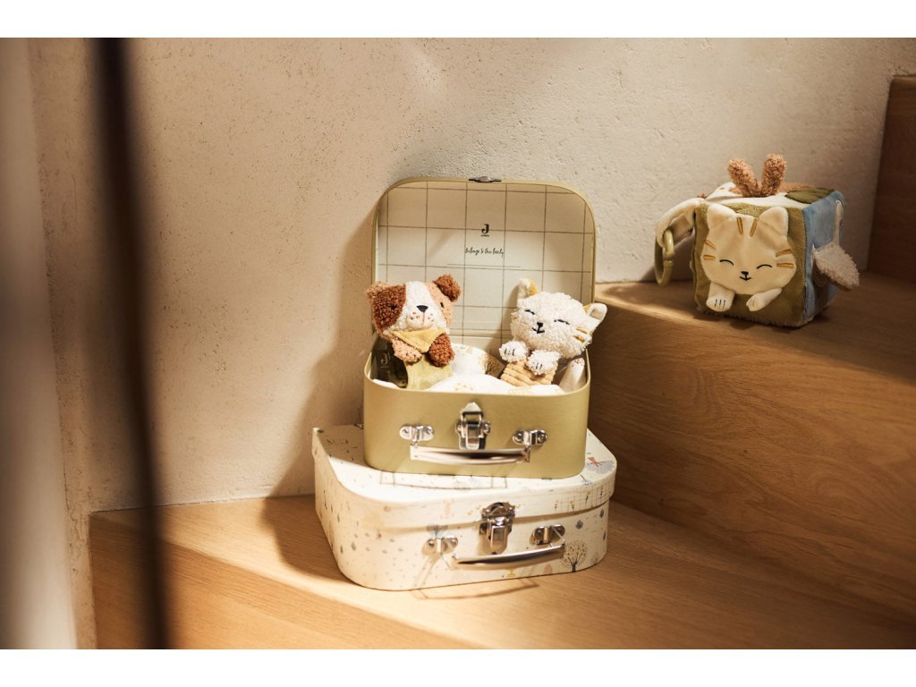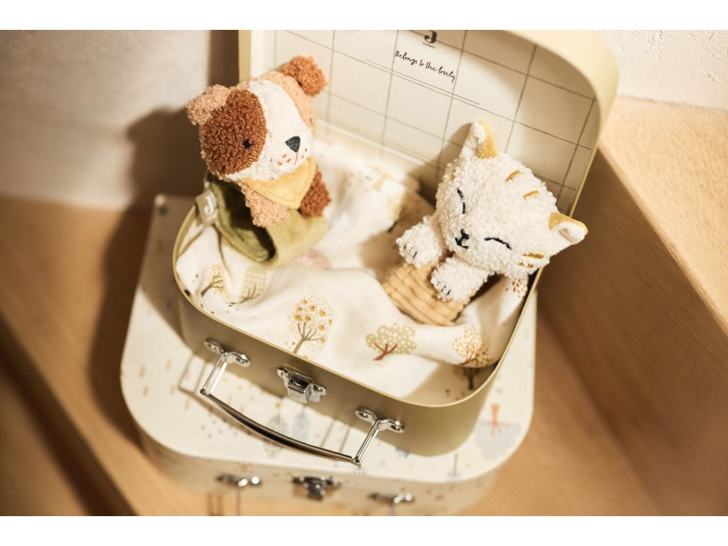 Toto chrastítko ve tvaru pejska se nosí jako náramek na zápěstí a díky tomu zůstane miminku stále po ruce. Pohybem ruky vydává jemný a veselý zvuk, který stimuluje sluch a podporuje zvídavost dítěte. Materiál s žlutými proužky je měkký a příjemný na dotek, ideální pro malé ruce. Chrastítko pomáhá rozvíjet jemnou motoriku, koordinaci i smyslové vnímání už od prvních dní života.