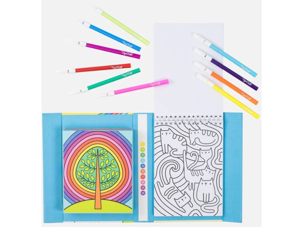 Kompaktní balení se vejde do tašky – ideální na cesty, do restaurace nebo na návštěvu. Fixy jsou součástí sady, takže stačí otevřít a tvořit.