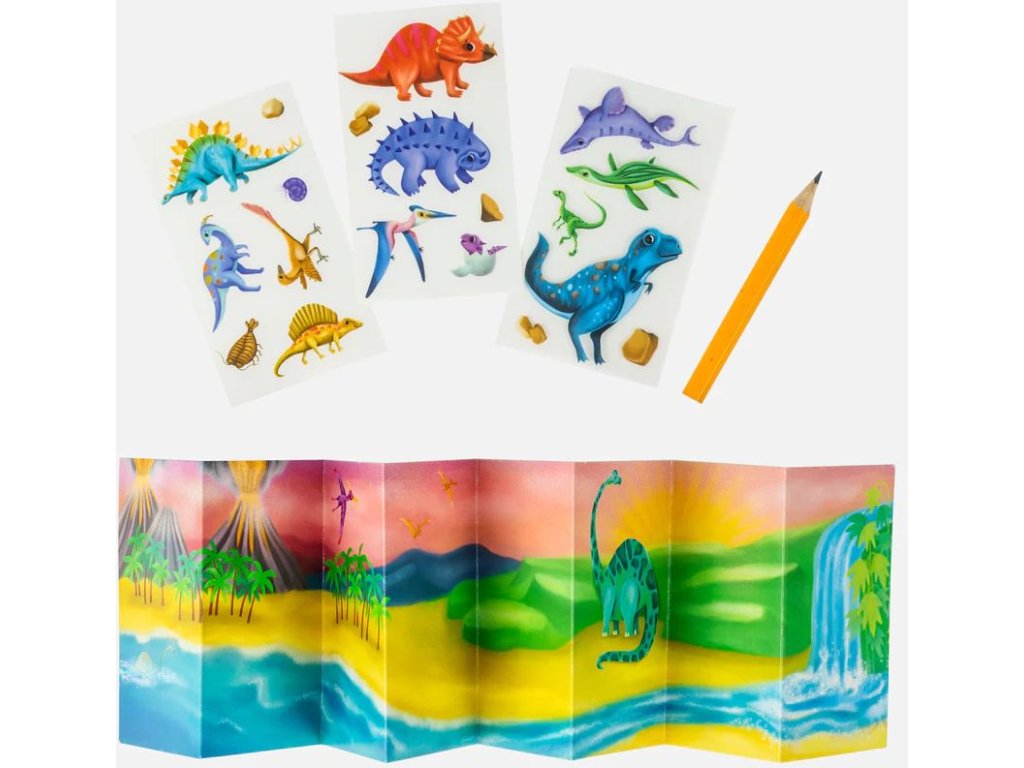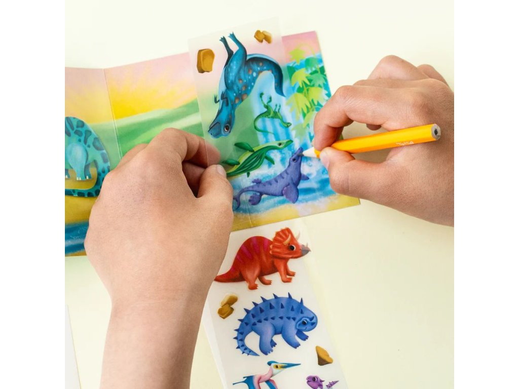 - Obsah: karty s pozadím, přenosové listy s dinosaury, stírací tužka.