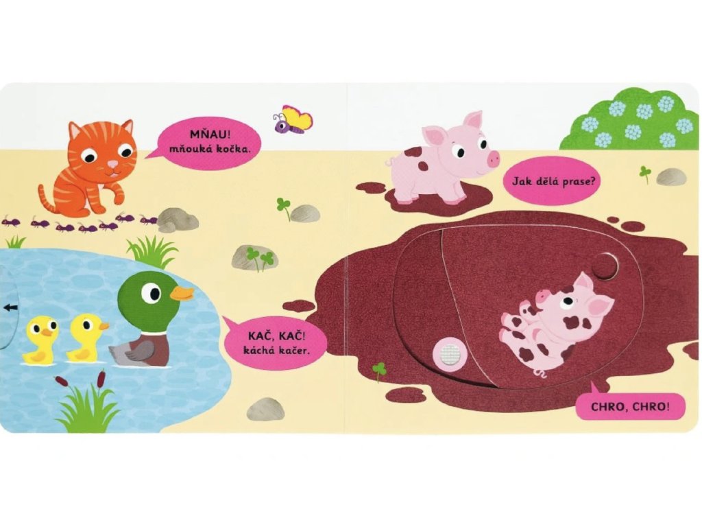 Pomocí pohyblivých prvků – posuvných částí, otočných koleček, tlačítek a otvorů – děti odhalují odpovědi na otázky typu “Kdo dělá tento zvuk?” a procvičují při tom jemnou motoriku. Stačí vložit prstík, zatáhnout, otočit nebo stisknouta zvuk se aktivuje, čímž se učení stává okamžitě zábavné a interaktivní.