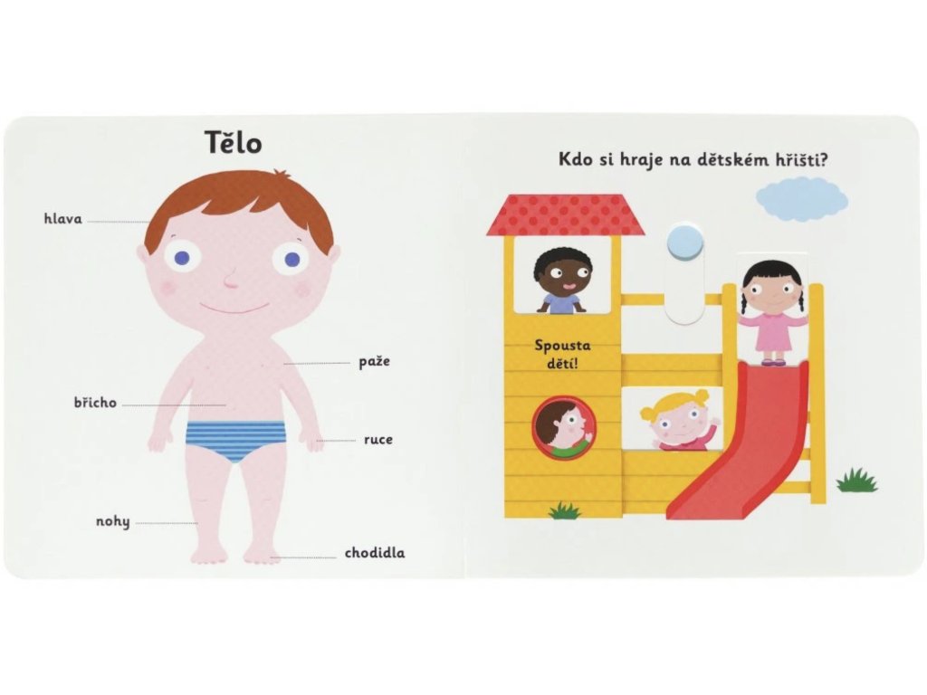 Pevné kartonové stránky s posuvnými a otočnými prvky umožňují dětem zkoumat a objevovat svět kolem sebe. Stačí vložit prstík do správného otvoru, vysunout, zatáhnout nebo otočit a dítě okamžitě pozná správnou odpověď. Díky tomu si malí objevitelé nejen rozšiřují slovní zásobu a učí se pojmenovávat části těla či pocity, ale zároveň si nenápadně procvičují jemnou motoriku.