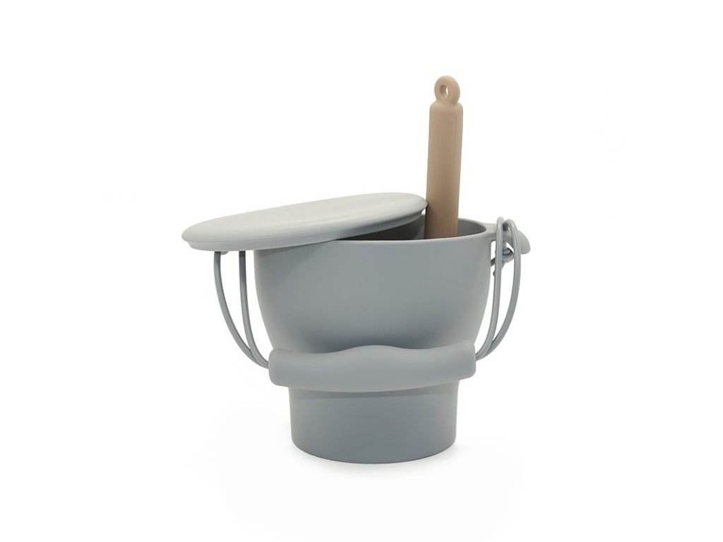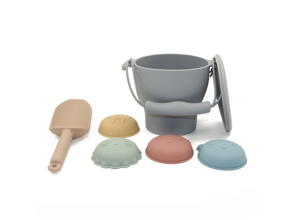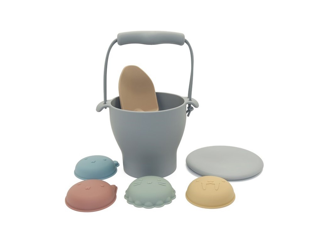 - Kyblíček (šedý) – se sklopným držadlem a odnímatelným víčkem, ideální pro stavění báboviček i přenášení písku