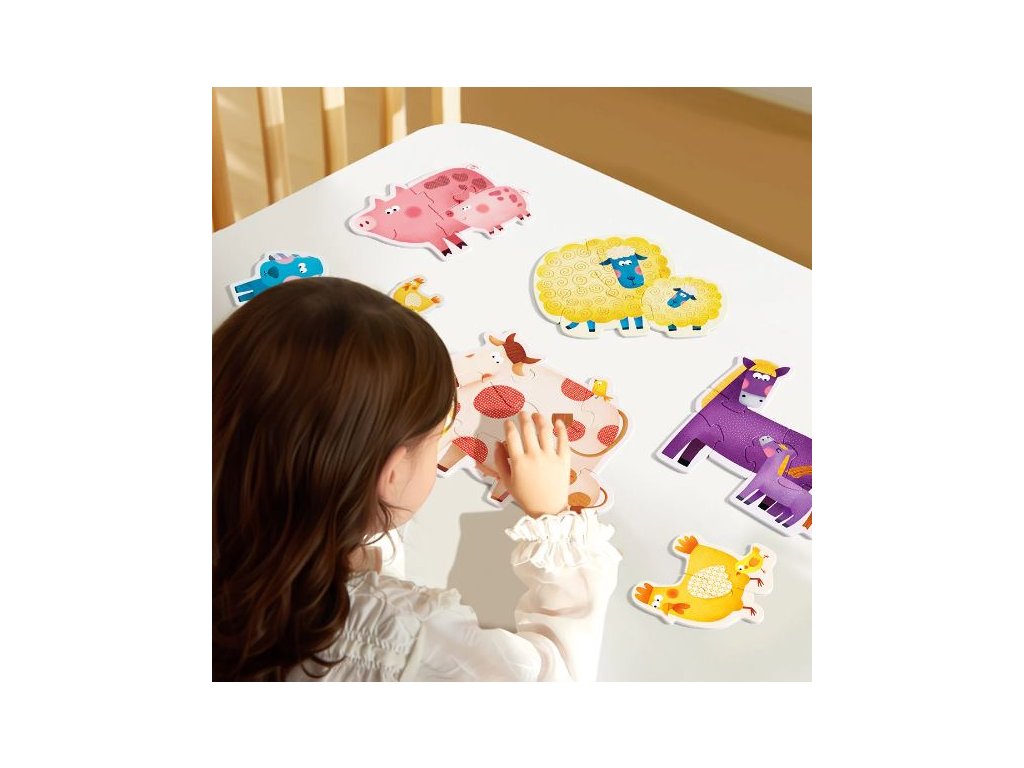 Každá skládačka má jiný počet dílků a obtížnost se postupně zvyšuje, což podporuje logické myšlení, trpělivost a rozpoznávání tvarů i zvířátek.