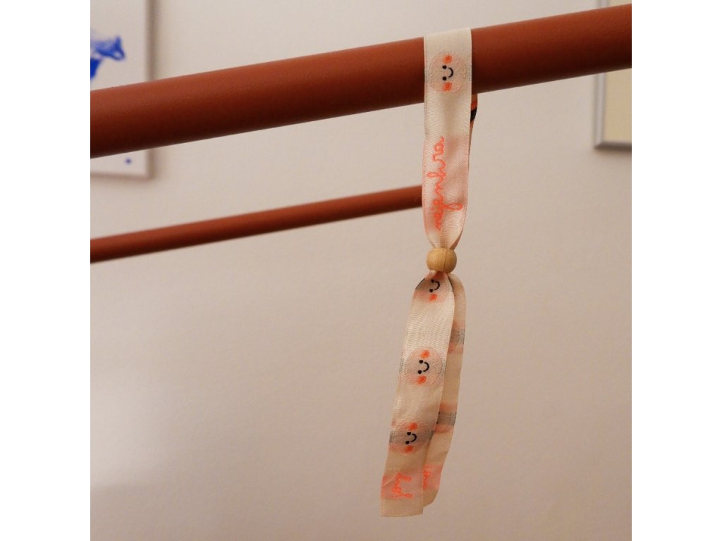 Materiál: textilní stuha s výšivkou, dřevěný korálek