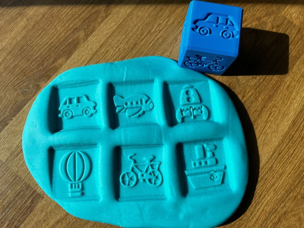 Stačí kostku přitlačit do plastelíny, modelíny nebo kinetického písku a hned se objeví roztomilý otisk auta, vlaku, letadla nebo jiného dopravního prostředku. Děti si hravou formou rozvíjí jemnou motoriku, fantazii i představivost.