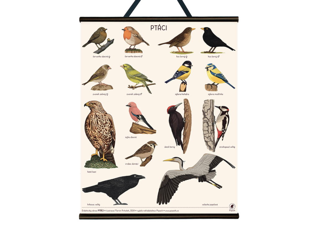 Plakát Ptáci přináší do třídy nebo dětského pokoje přehled nejběžnějších českých ptáků. Děti se naučí poznávat druhy, které skutečně potkají – na zahradě, v parku, v lese nebo u krmítka. Každý pták je popsán českým názvem a nakreslen s precizností, která připomíná klasické přírodovědné atlasy.
