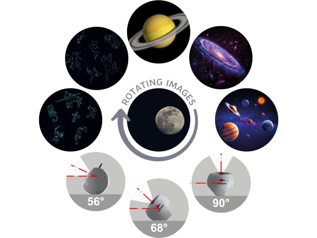 Součástí balení je ilustrovaná vzdělávací brožura, která děti seznamuje se základními pojmy o vesmíru a souhvězdích. Projektor je vybaven šesti vyměnitelnými disky, díky kterým lze projekce snadno obměňovat a udržet dětský zájem dlouhodobě.