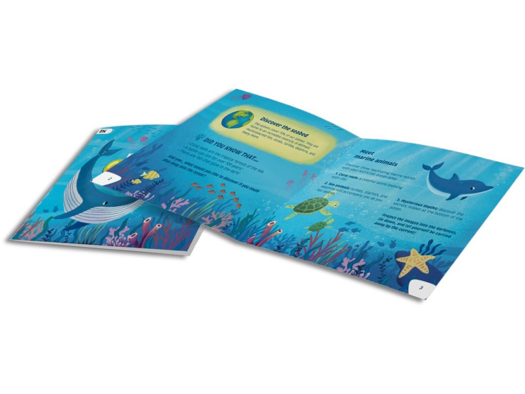 Součástí balení je ilustrovaná vzdělávací brožura, která dětem přibližuje svět oceánu, mořských živočichů a jejich prostředí. Šest vyměnitelných disků umožňuje obměňovat projekce a udržet dětskou zvědavost dlouhodobě.