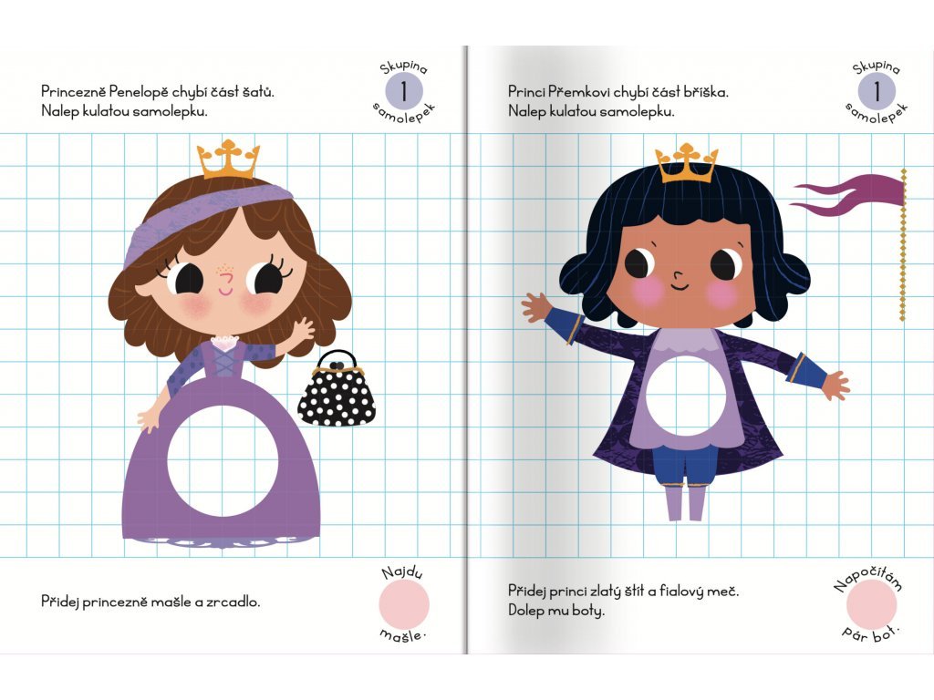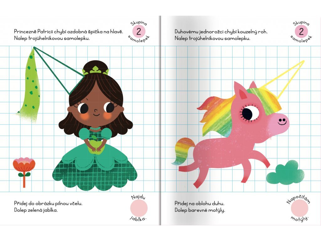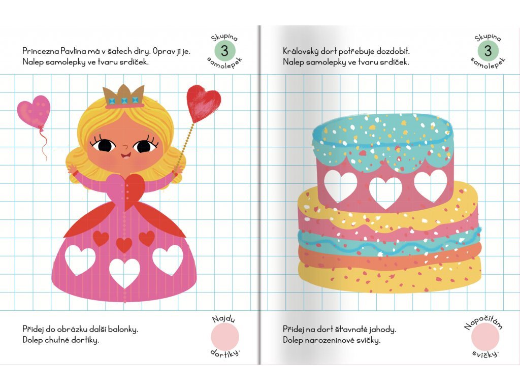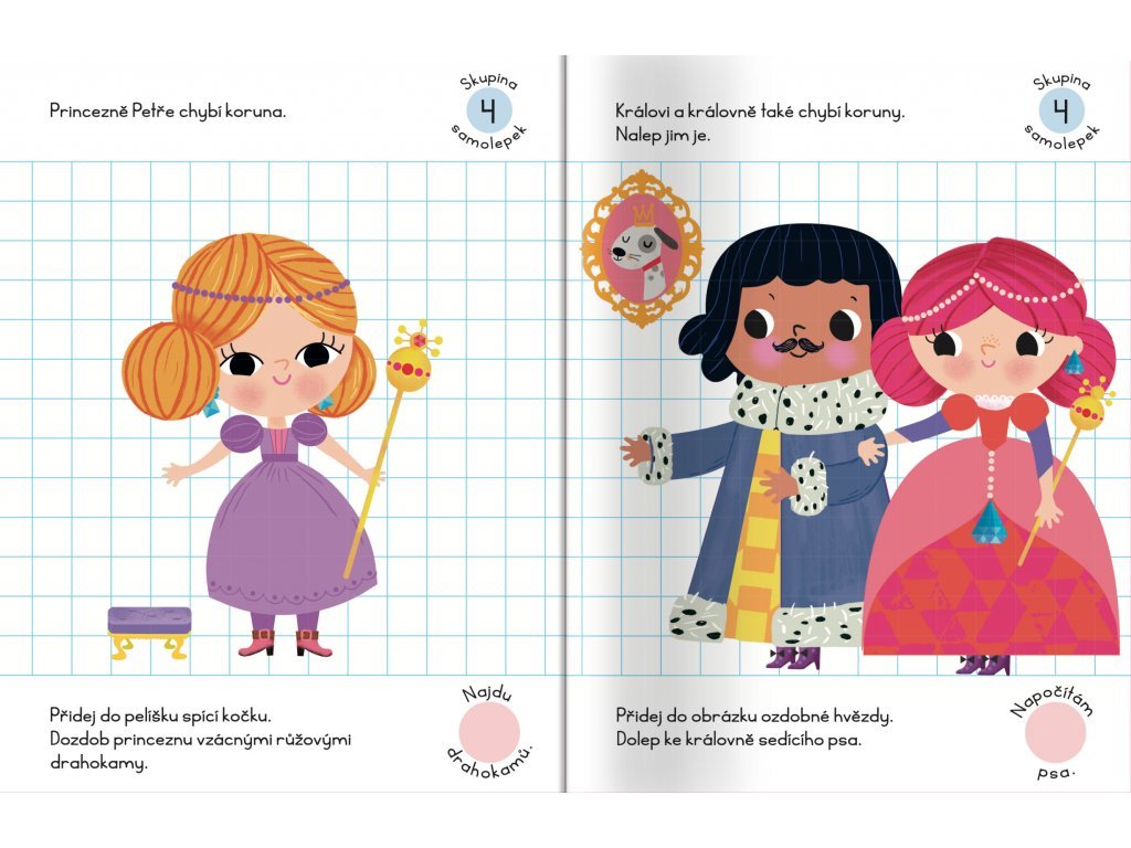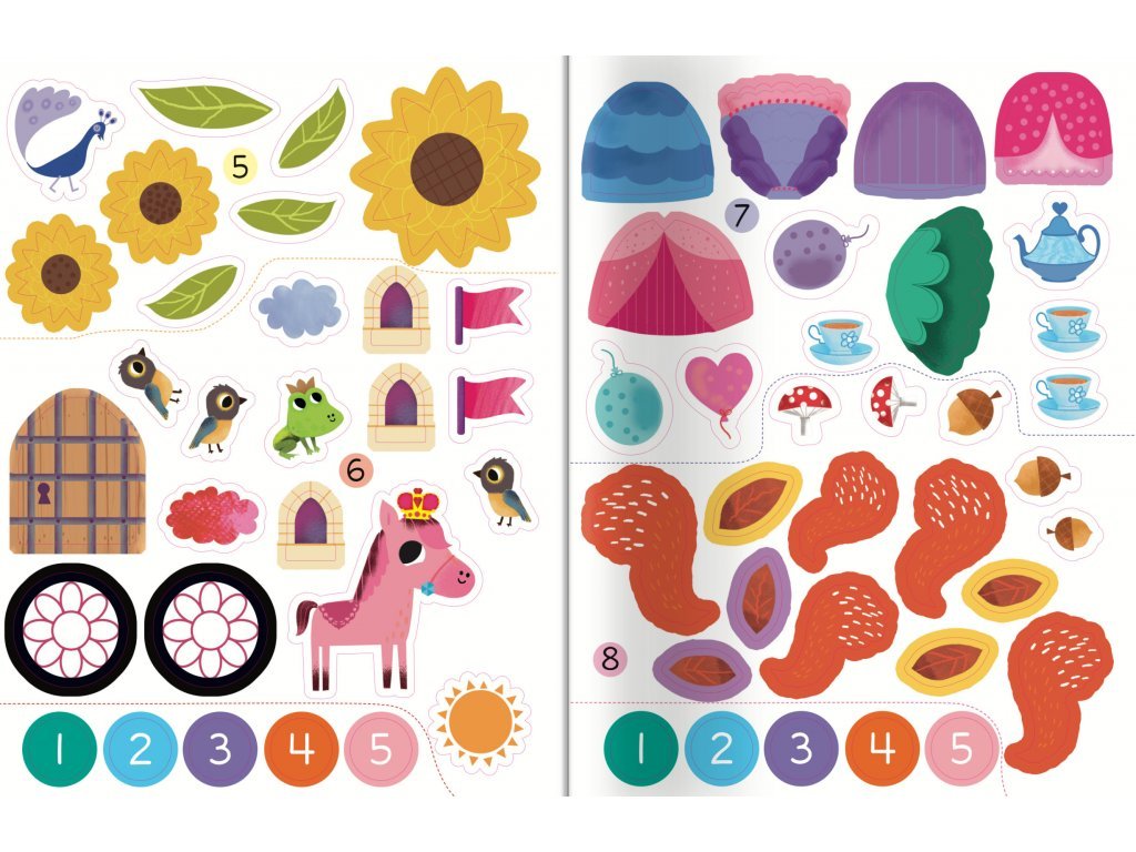 Každá stránka obsahuje drobný úkol na počítání od 1 do 5 a více než 100 barevných samolepek, které děti motivují k dokončení obrázků. Ideální zábava pro malé milovníky princezen.