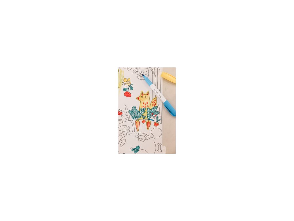 Kreativní sada pro malé umělce s motivem zahrady, plné květin, zvířátek a přírody. Silikonová omalovánka o rozměrech 40 × 30 cm umožňuje dětem vybarvovat obrázky pomocí čtyř fixů s tekutou křídou v barvách červená, žlutá, tmavě zelená a světle modrá.