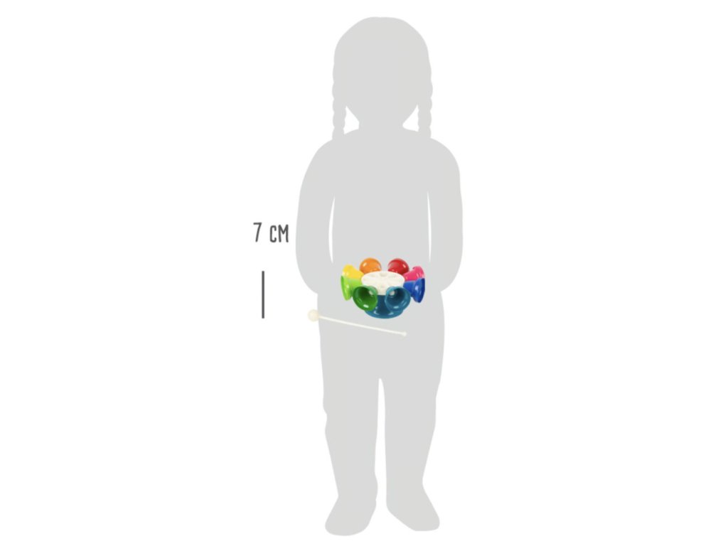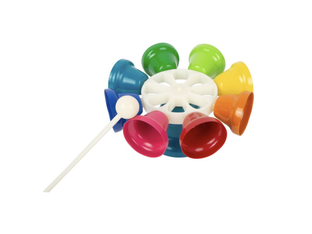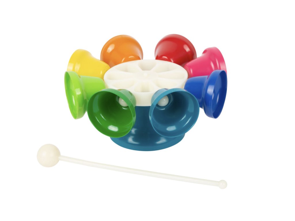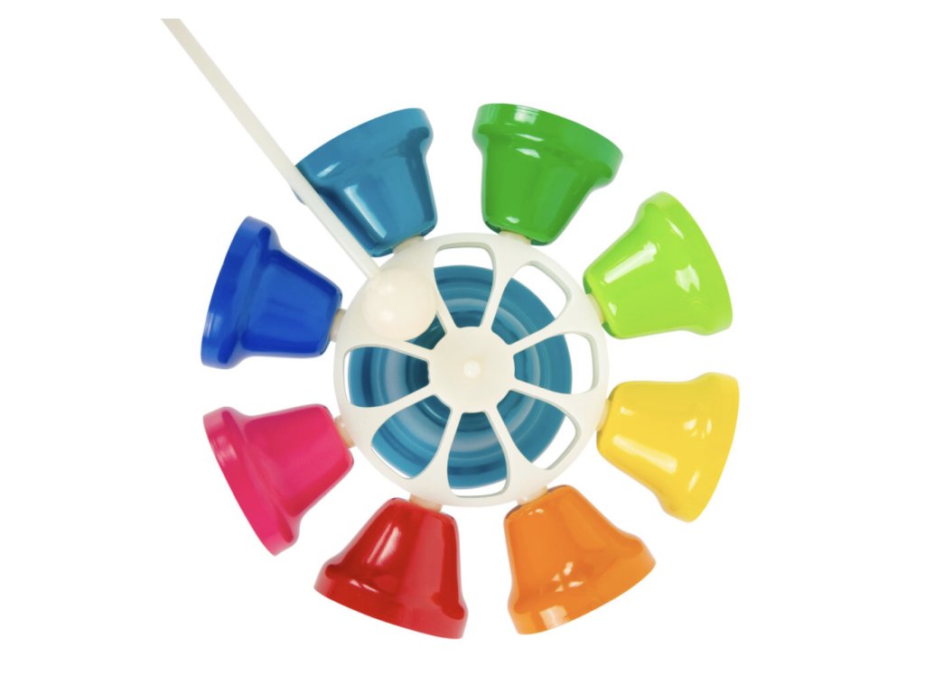 Objevte svět hudby s tímto krásným barevným kolotočem se zvonečky, který děti nejen pobaví, ale i vzdělá. Každý z osmi kovových zvonečků je naladěn na jiný tón stupnice (C, D, E, F, G, A, H, C), přičemž každý tón má svou vlastní barvu – díky tomu se děti snadno naučí hudební základy a rozlišování výšek tónů.