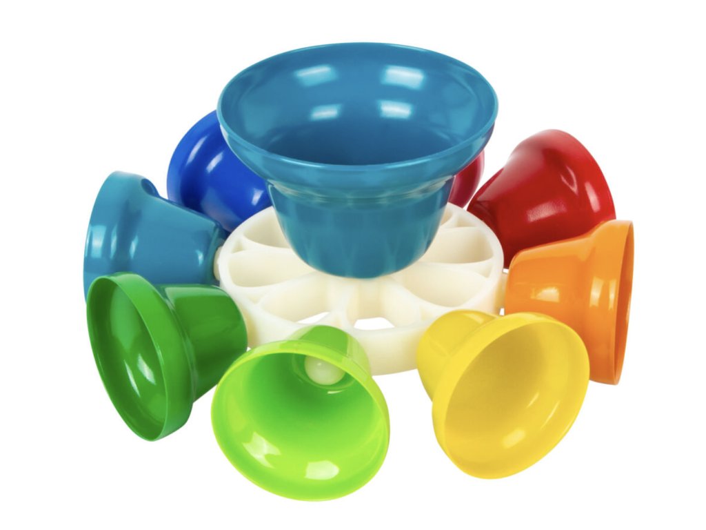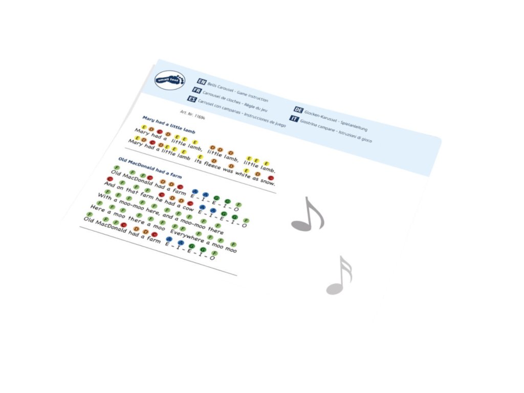 Zvonečky lze používat buď samostatně v ruce, nebo ponechat na stabilním stojanu a hrát na ně přiloženou paličkou, podobně jako na xylofon. Součástí balení je i sada 8 jednoduchých písniček pro začátečníky (v angličtině), které jsou navíc označeny barevně podle tónů – ideální pro malé děti bez znalosti not.