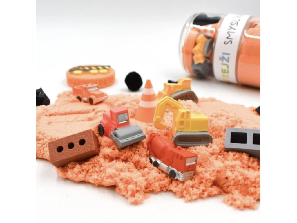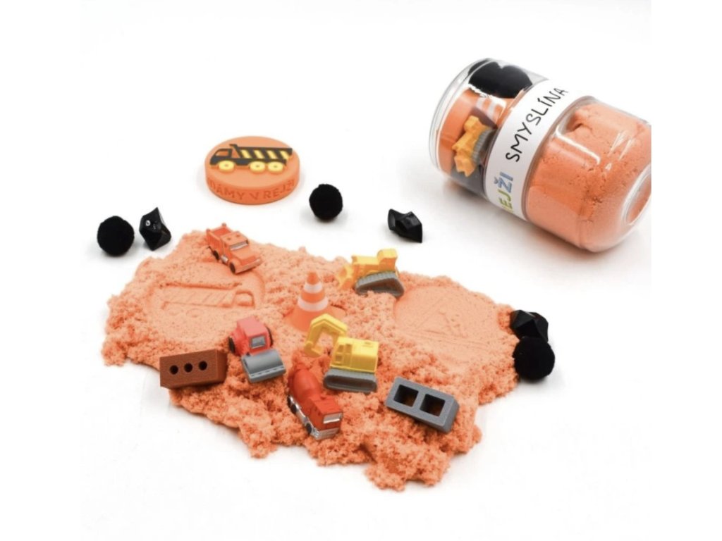Smyslína „Na staveništi“ je kreativní smyslová sada, která dětem otevírá svět bagrů, stavebních strojů, cihel a kuželů. Obsahuje hebký Kineťáček – hvězdný kinetický písek, který skvěle drží tvar, nelepí, a přitom zůstává měkký a příjemný na dotek.