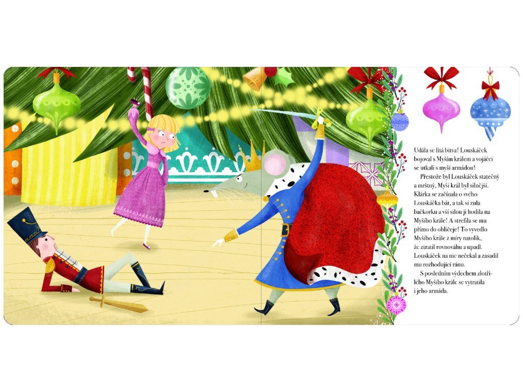 Společně se vypravíte do snové říše, kde Klárka s Louskáčkem svádí odvážný boj s Myším králem a poté vstoupí do nádherného Království sladkostí. Příběh je vyprávěn v jemném, dětem srozumitelném podání a doplněn měkkým okénkem s třpytivými vločkami, které přidává knížce neodolatelné kouzlo – ideální pro dlouhé zimní večery.